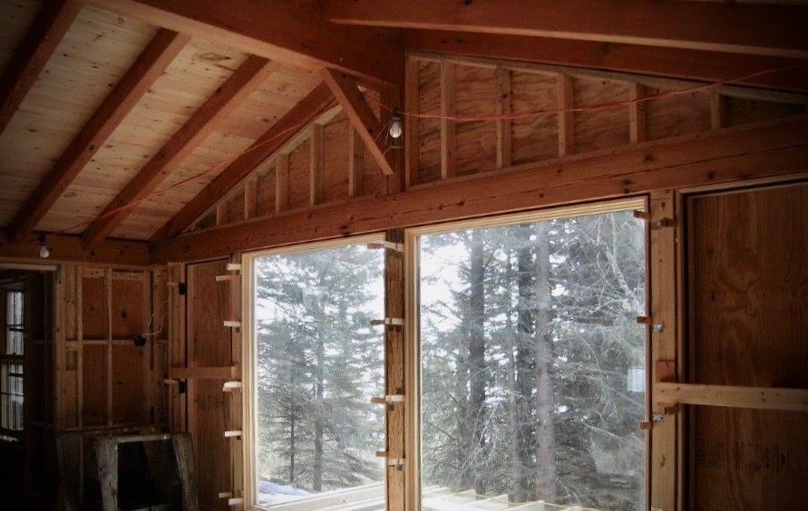 Inspired by mountain "fire lookouts" - this home was built with reclaimed Douglas fir timbers - mostly from the Portland harbor. The exterior porch timbers are "standing dead" Western Larch. This small timber frame sits on a high Sawtooth Mountain palisade with views to Lake Superior. The clients spent 10 days in the Montana shop helping with joinery on their small custom home. Home and frame/joinery design by Tom Healy