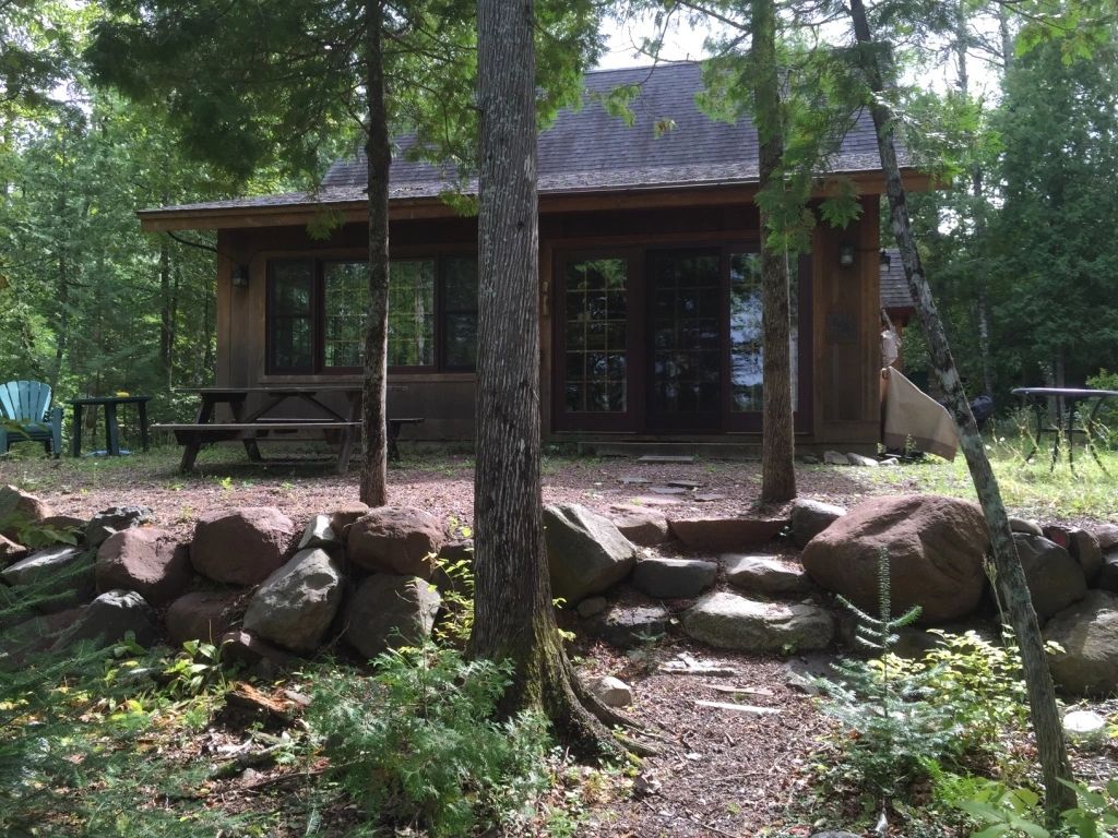 Nestled into the cedars on a Boundary Waters Canoe Area Wilderness entry lake, this sweet little cabin is built of reclaimed Douglas fir timbers. The integrated timber staircase, with fir and bronze spindles, is a unique addition to this tiny Northwoods hideaway. The cabin is enclosed with Structural Insulated Panels. The "Frost-protected" concrete slab" - with a stained concrete "tile" floor make for a high-value and energy-efficient foundation. Frame and home design by Peter Henrikson and Tom Healy. Timber frame and complete build by Tom Healy.